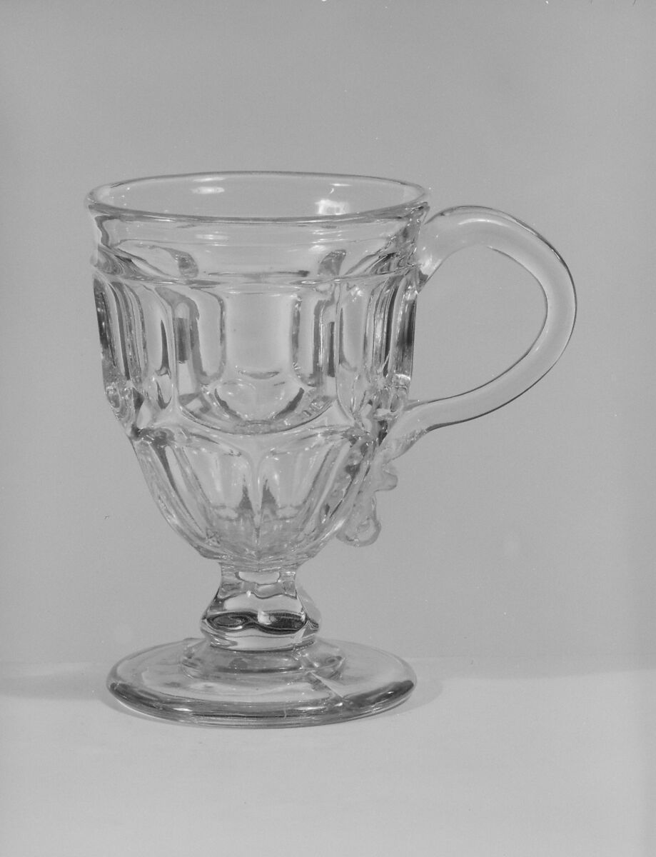 With the development of new formulas and techniques, glass-pressing technology had improved markedly by the late 1840s. By this time, pressed tablewares were being produced in large matching sets and innumerable forms. During the mid-1850s, colorless glass and simple geometric patterns dominated. Catering to the demand for moderately-priced dining wares, the glass industry in the United States expanded widely, and numerous factories supplied less expensive pressed glassware to the growing market. At the Exhibition of the Industry of All Nations at New York’s Crystal Palace in 1853, for example, the New England Glass Company exhibited 130 pieces of one design, "consisting of bowls, tumblers, champagnes, wines, and jelly glasses." This object belongs to one such service. Although the glass manufactory is not known, the glassware is very typical of the large services that were very popular with America’s middle class in the nineteenth century.