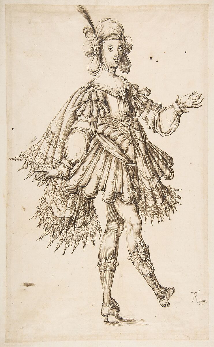 Male figure in a ballet costume made up of a tonnelet over a chemise, tight-fitting breeches, stockings, decorated with large grotesque figures on the calf, and high heeled, round-toed shoes with rosettes with pointed petaloids. A cape, decorated with pointed lace motifs, and a headdress, made up of fabric wrapped elaborately around the hair and decorated with a grotesque brooch flanked by a thin feather, complete the costume. A drawing of a female figure by the same hand, bearing a similar inscription, was sold at Piasa, Paris, December 3, 2014 (lot 8). Both appear to be signed "T Remy," an artist about whom nothing is known.