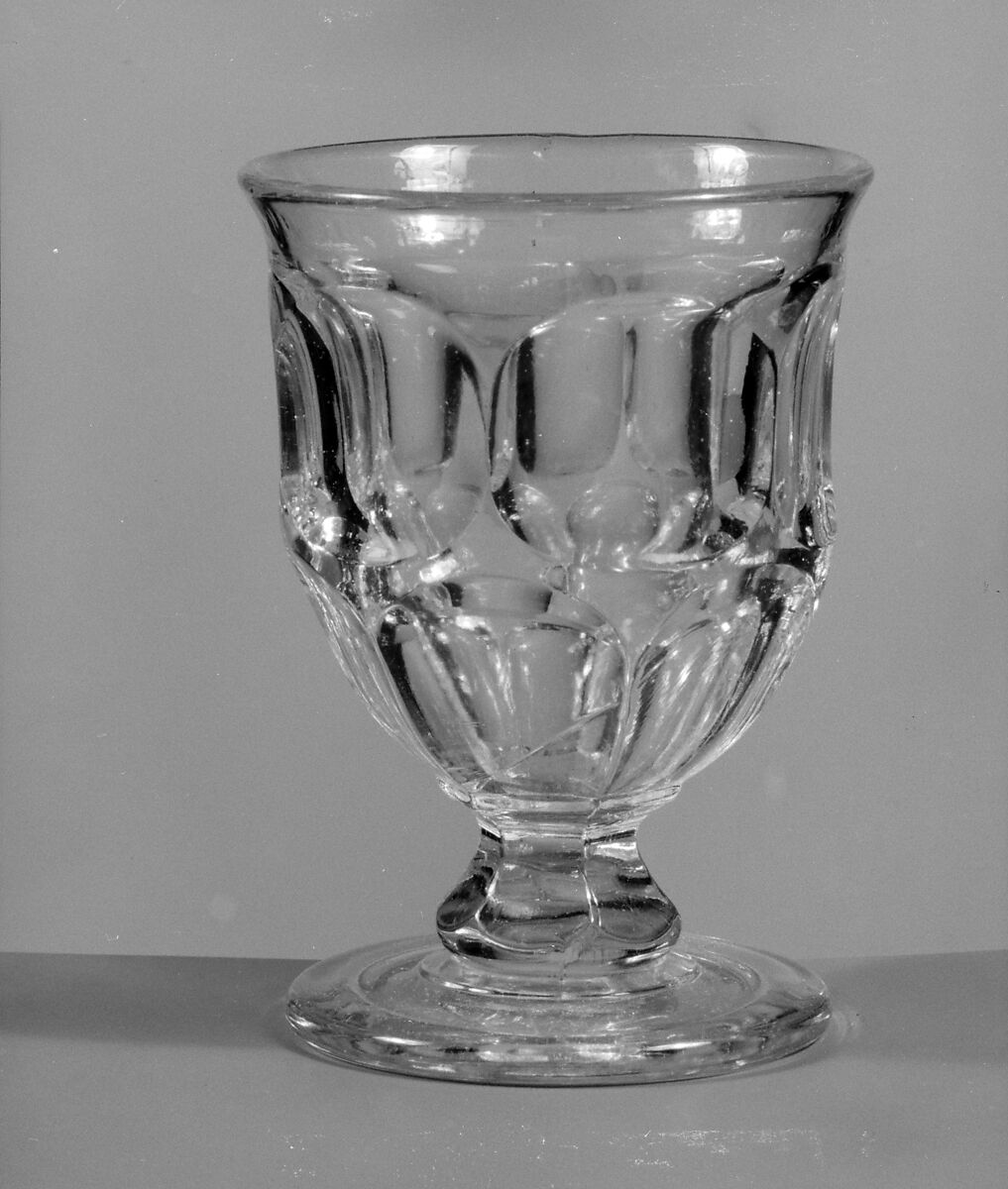 With the development of new formulas and techniques, glass-pressing technology had improved markedly by the late 1840s. By this time, pressed tablewares were being produced in large matching sets and innumerable forms. During the mid-1850s, colorless glass and simple geometric patterns dominated. Catering to the demand for moderately-priced dining wares, the glass industry in the United States expanded widely, and numerous factories supplied less expensive pressed glassware to the growing market. At the Exhibition of the Industry of All Nations at New York’s Crystal Palace in 1853, for example, the New England Glass Company exhibited 130 pieces of one design, "consisting of bowls, tumblers, champagnes, wines, and jelly glasses." This object belongs to one such service. Although the glass manufactory is not known, the glassware is very typical of the large services that were very popular with America’s middle class in the nineteenth century.
