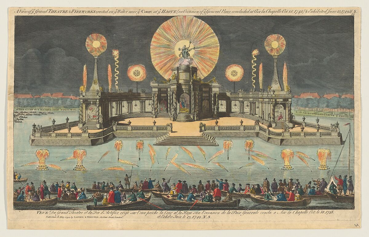 - Title: A View of ye Grand Theatre & Fireworks erected on ye Water near ye Court at ye Hague (on Occasion of ye General Peace concluded at Aix la Chapelle. Oct. 18. 1748) & Exhibited June 13, 1749