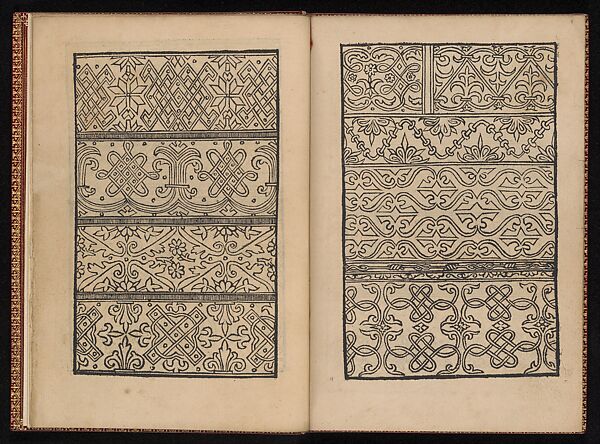 According to Lotz loc.cit. this is a new edition of Hofer's Ain new Form buech'len...Augsburg, 1545. (Lotz 18). This is the second of two editions, the first is undated and has 36 leaves. The title cut is a copy of the one by Beham on the title of Egenolff's Modelbuch aller Art Nehwens, Wirckens und stikens. (Lotz 20 and ca. 1550). Lotz records only this copy of this edition. The Hofer patterns were copied from the Guentel of 1541 (Lotz 16). 40 leaves, unnumbered. Sigs: A- K 4, Tear in middle sig. F 2. Printer's mark of Heitz, Paul, Frankfurt..drucker-und verlegerzelehen bis in 17 jahrhhundert 1896; pl. XXXIIV, fig. 12 (numbered 22). Cf. Bibl. Soc. Trans. Vol. VII, p. 228, no. 29 which is perhaps a later issue. Bound in red morocco, spine stamped and gilded.