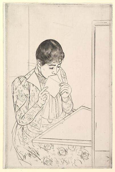 Between 1890 and 1891 Cassatt produced ten color aquatints inspired by an exhibition of Japanese ukiyo-e woodcuts she had seen at the École des Beaux-Arts in Paris in spring 1890. Her work led Degas to remark, "I do not admit that a woman can draw like that." Cassatt's images depict such scenes of everyday life as a tending a child, writing a letter, or riding the bus. In this only known impression of the first state of The Letter, Cassatt traced the basic design in drypoint; its appealing rough texture derives from the rich burr thrown up by a needle scratching through copper. With the wallpaper, chair, and desktop still to come, the figure appears more immediate and volumetric than in the print's final state.