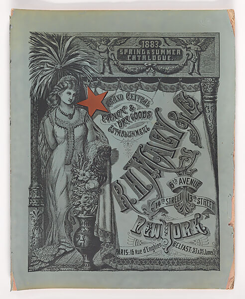 By 1883, Macy’s had an international reach, with stores in New York, Paris, and Belfast. The cover of this large catalogue features the company’s iconic red star, shown near the shoulder of a beautiful woman whose flowing hair and loose gown reflect Aesthetic-era taste.