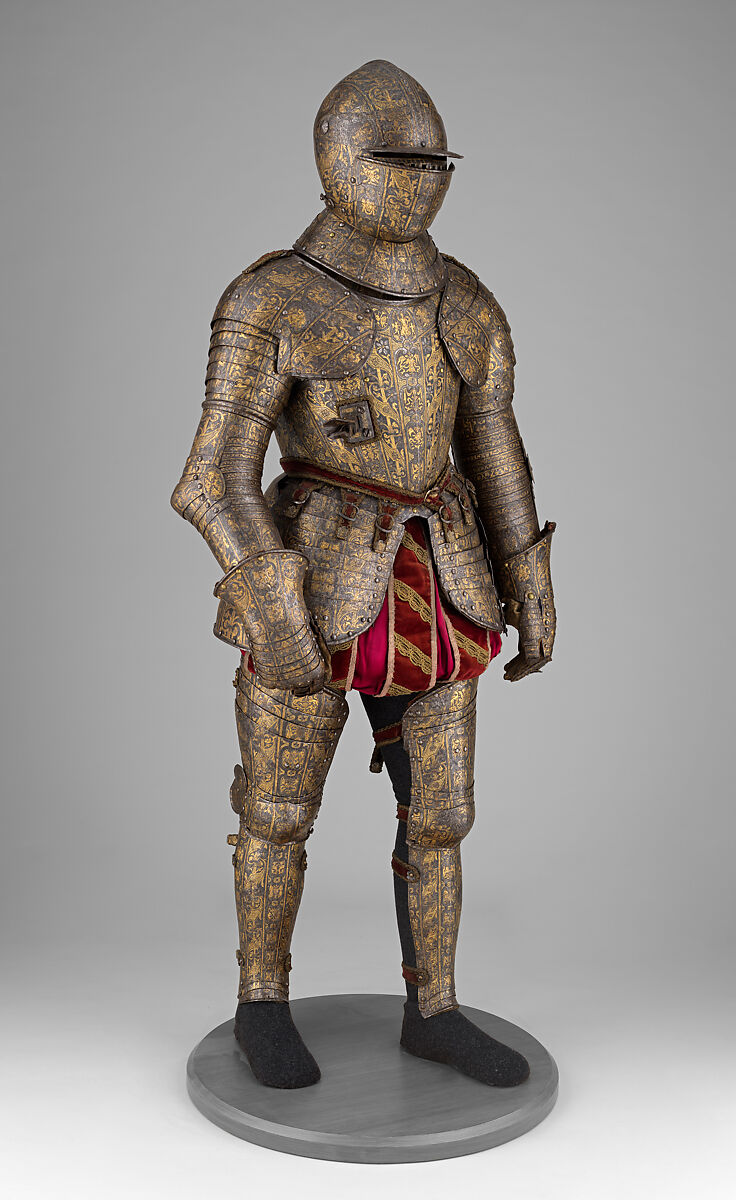This exceptionally well-preserved armor was made for an adolescent or a small adult who was undoubtedly a member of an important noble family. It belongs to a select group of Milanese armors made between 1590 and 1610, in which etched decoration was abandoned in favor of engraving, punching, gilding, and damascening. This armor demonstrates the high standard maintained by the best northern Italian armorers at the turn of the seventeenth century.