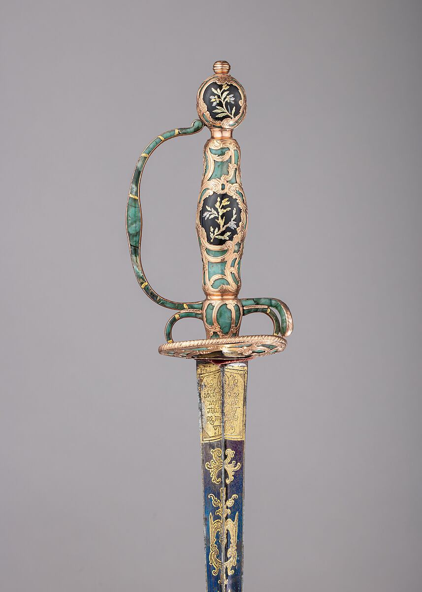 By the early seventeenth century, the rapier, a long slender thrusting sword, began to dominate as the gentleman’s weapon of choice. During the course of the century, however, as civilian fencing techniques became more specialized and refined, the rapier developed into a lighter, trimmed-down weapon known by about 1700 as the smallsword. Smallswords, often richly decorated, remained an integral part of a gentleman’s wardrobe until the wearing of swords in civilian settings went out of fashion at the end of the eighteenth century, at which time pistols were replacing swords as arms most frequently used in personal duels. The majority of smallsword hilts are made of silver or steel, but many also employ a wide variety of luxurious materials, such as gold, porcelain, and enamel. At their best, smallswords combine the crafts of swordsmith, cutler, and jeweler to create an elegant weapon that was also a wearable work of art.
