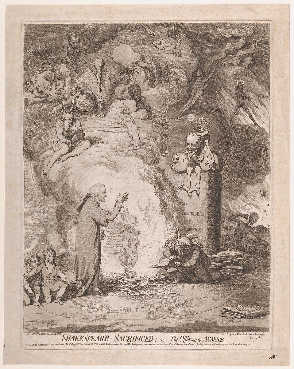 Between 1789 and 1805, the publisher John Boydell ran the Shakespeare Gallery, a popular London exhibition space financed by print subscriptions. When Boydell failed to hire Gillray to make prints for the project, the satirist reciprocated with this scathing parody of the scheme. Boydell appears as a high priest sacrificing the Bard’s writings to Avarice—a grinning figure with moneybags near a fool who fans the flames. Smoke obscures a famous memorial and then rises to support characters derived from paintings shown in the gallery. Bottom points to his magical ass’s head, and King Lear is given a crassly modern brick throne. Fearing reprisal, Gillray used a pseudonym in this rare early state. He substituted his real name when the print proved a success, coveted even by the artists it mocks.