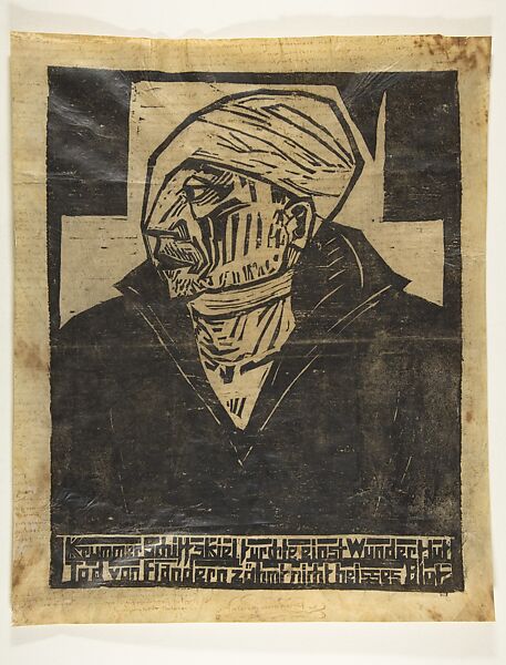 Heckel embraced the woodcut technique for its expressive potential and its links to earlier German artists and craftsmen. While serving in a medical unit in Belgium, he made many pictures of the injured, including this portrait of a sailor with bandages wrapped tightly around his head like a turban. Heckel achieved a raw, unrefined aesthetic that corresponds to the primitive brutality of the war; gashes he cut in the wood to create the image parallel the sailor’s wounds, suggesting both physical and psychological scars. The man’s sacrifice is suggested by the cross-like area of uninked parchment that frames him. Because paper was scarce, Wounded Sailor was printed on the back of a found seventeenth-century Dutch manuscript page.