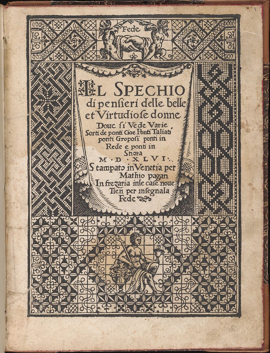 Illustrated title page with printer's mark, 26 pages of designs used for cut-work and embroidery by counted threads.