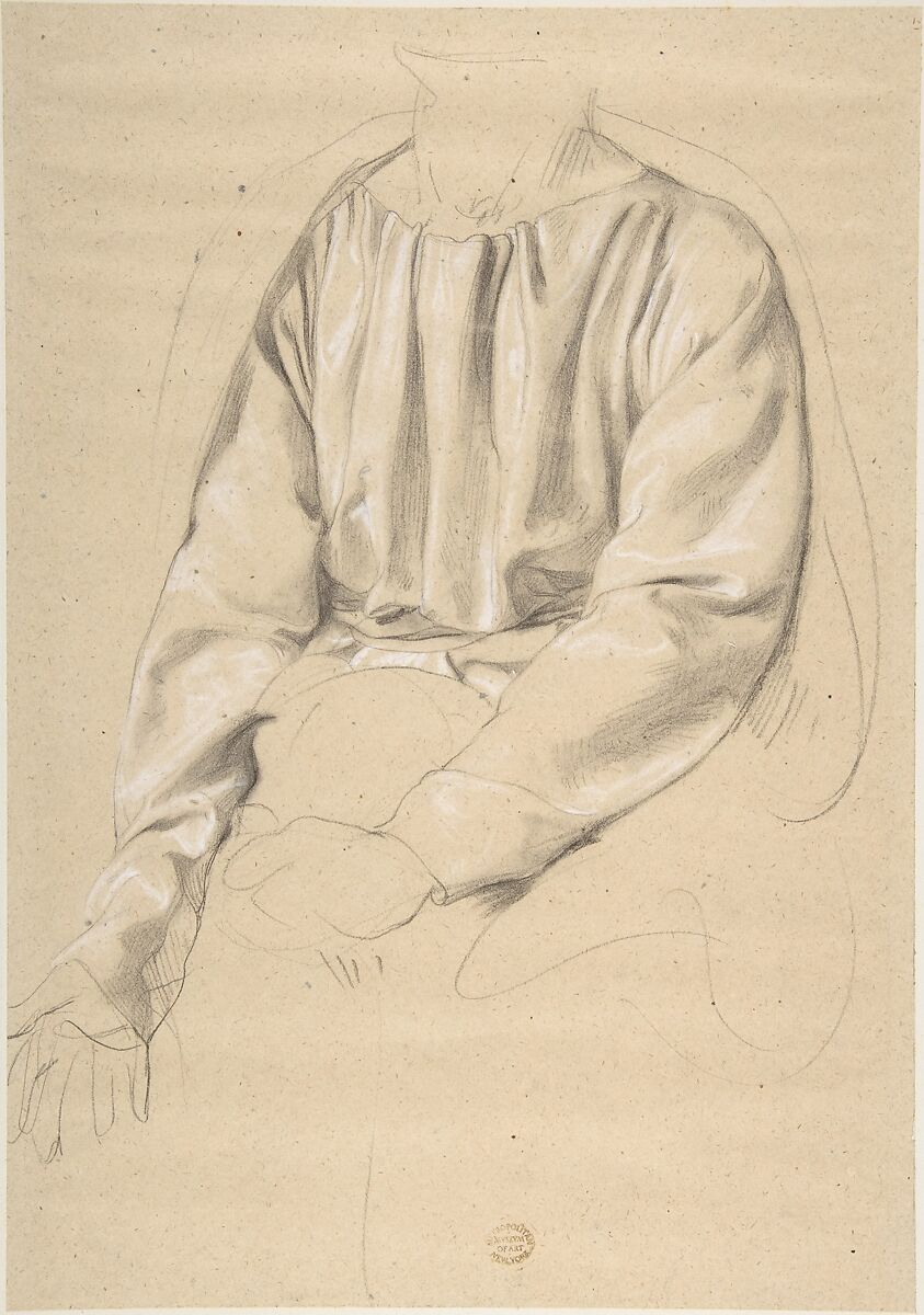 This drawing of the upper part of a gown worn by a lightly sketched form comes from a group of eleven sheets once attribued to Frederic Lord Leighton, but now identified as by Romain Cazes. Cazes was a student of Ingres who painted murals in churches in both Paris and southwest France, and these drawings demonstrate his adherance to academic practice. The latter directs artists to make separate studies of posed nude figures and their garments as compositions are planned. The group were donated to The Museum by Albert Eugene Gallatin, an influential New York collector and critic who promoted "Art for Art's Sake," insisting that aesthetics, rather than narrative or moral concerns, underpins enduring art.
