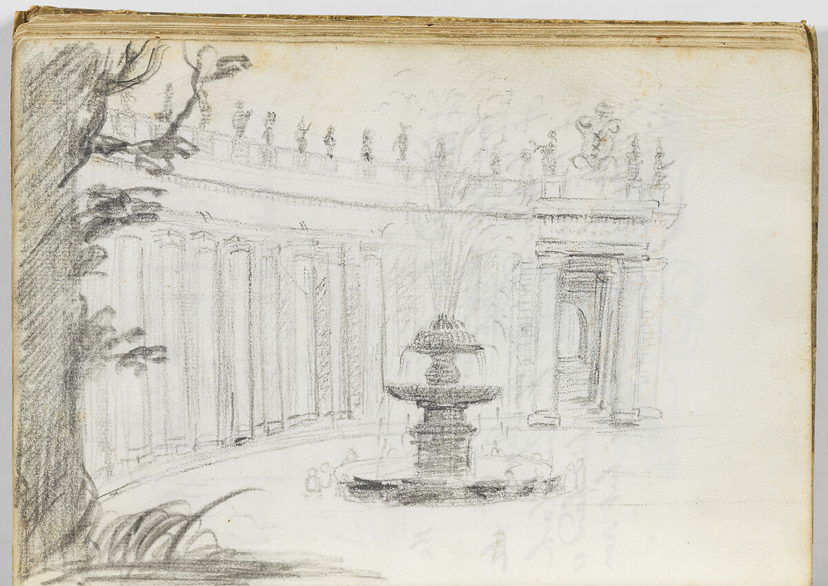 Reynolds visited Italy for three years while in his twenties and seized the opportunity to study works from antiquity to the more recent Baroque era. As he explored churches and collections, Reynolds filled many sketchbooks with notes and drawings. This example records paintings, sculpture, and architecture visited in Rome, Florence, Venice, Milan, and Turin. It was made by using twine to secure sheets of paper into a vellum binding and could have been purchased from a stationer or made by the artist himself. The open pages represent Bernini’s famous colonnade around St. Peter’s Square in Rome opposite a rough sketch of a bearded man framed by a rustic pergola.