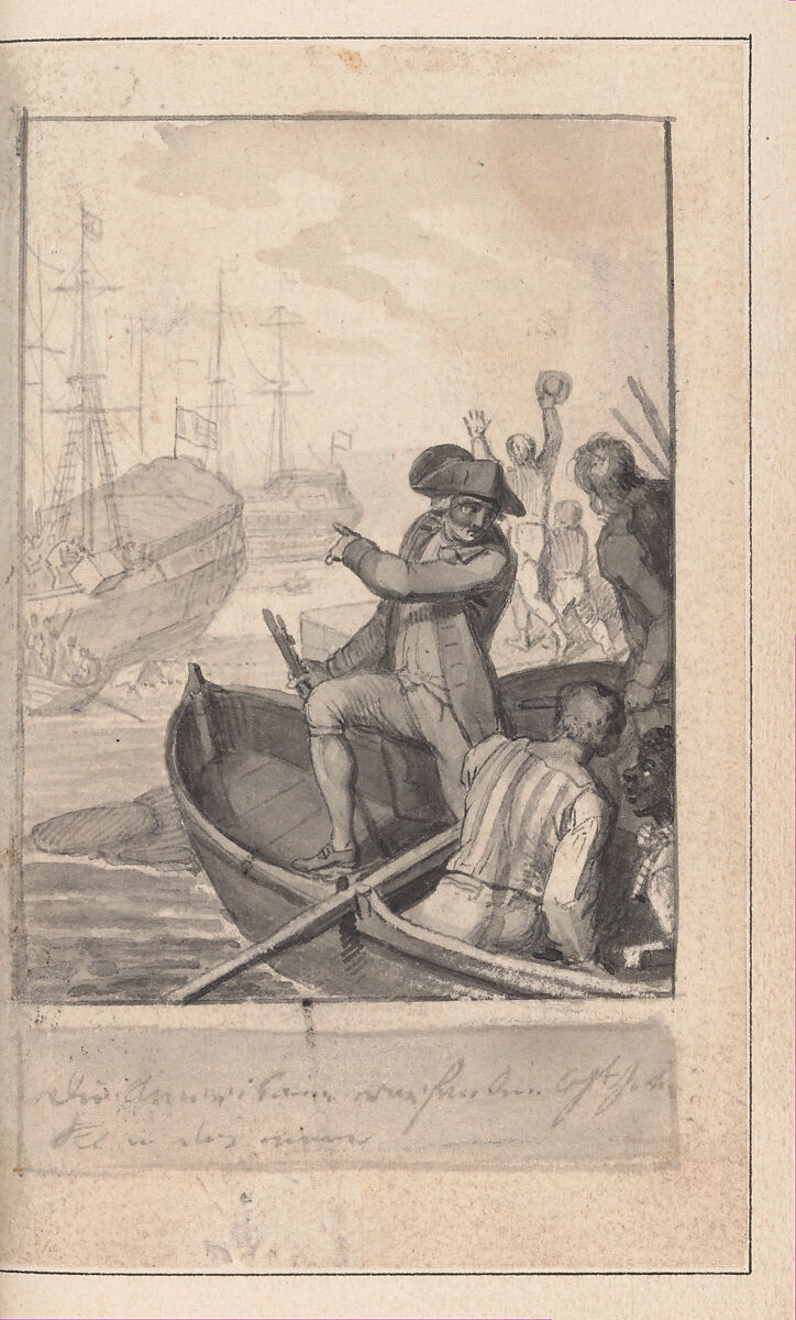 (35) opposite p. 145: Ramberg, Departure of English troops from New York (different composition than Chodowiecki), pen and ink and wash drawing; inscribed in ink, lower left corner of image: "HR".