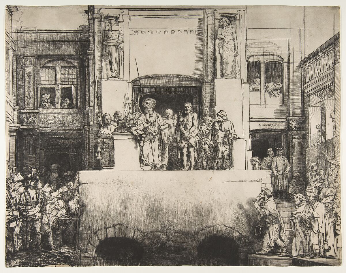 Rembrandt treated this large drypoint almost as a painting, making marked changes to the composition as he reconceived the scene over and over. In the sixth state of the print, he removed much of the original crowd that stood directly below the main event and replaced it with two brick arches over an unidentified chasm. Between the arches he also added a sculpted male figure, lightly covered over in this, the final, state. The iconographic significance of these changes remains a mystery, but compositionally they serve to thrust the viewer into direct confrontation with Christ's fate.