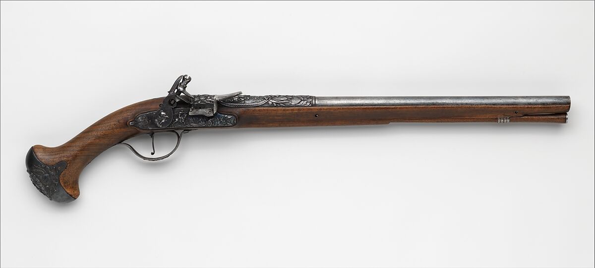 This pistol is one of a small group of flintlock guns and holster pistols with high relief chiseling on the barrels, locks, and mounts. The decoration includes military scenes with figures in seventeenth-century costume, trophies of arms, and Classical figures. Not signed or marked, these firearms are thought to have been made in eastern France of The Netherlands, perhaps in Liege (in modern Belgium). This pistol, one of a pair, belonged to the famous Swedish general Carl Gustaf, Count Wrangel, who acquired several firearms of this type in Liege in 1651. Wrangel's armory, largely intact, is preserved in Skokloster Castle, Sweden.