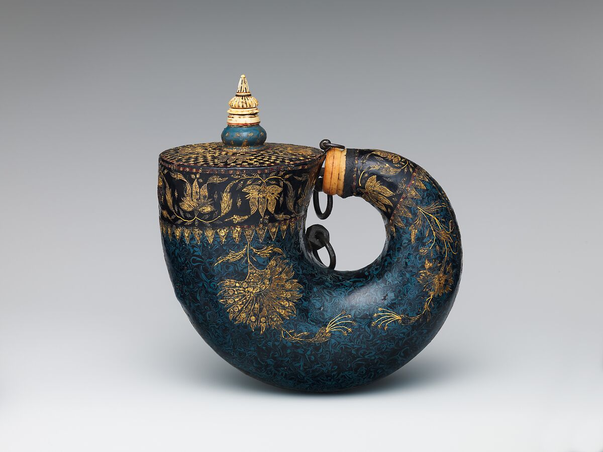 Designed to hold gunpowder, this flask, shaped like a nautilus shell, is made of wood, covered with a marbled pattern of blue and black lacquer, and bordered by delicate floral designs in gold. The skill and sophistication of the decoration place this work among the most beautiful objects of its kind from Mughal India.