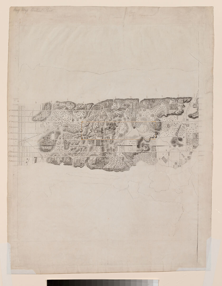 This proof impression includes the center of a large topographical map of Manhattan published in 1836 and encompasses the area between 19th and 133rd Streets, showing the City grid's rapid uptown advance. The cross streets are now fully graded and paved to about 23rd Street, and all traces of the original topography have been obliterated as far north as 30th Street and the beginnings of Murray Hill. The map depicts but does not highlight the uptown public squares that were so prominenet on the Commissioners' Plan. An unknown hand used a tan wash to delineate the boundaries of the future Central Park as it would be configured between 1853 and 1859.