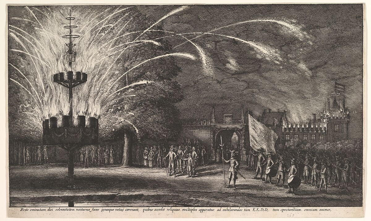 Fireworks at Hemissem; nocturnal scene, with fireworks; pole supporting round platform with burning barrels and blazing rockets at left; soldiers and drummers in the foreground at right; castle illuminated in the background.