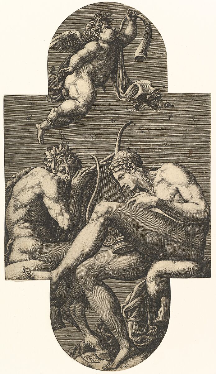 This engraving depicting the contest between Pan and Apollo is based on one of four frescoes—the other three represent groups of Muses—that surrounded a central depiction of Venus and the Fates on the vault of the Galerie d'Ulisse at Fontainebleau. Given the planetary symbolism of the ceiling, known today only through descriptions, prints, and drawings, it seems likely that the music making here is associated with the harmonies of the cosmos.