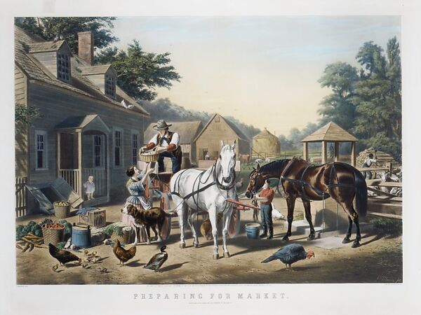 In this idyllic farm scene, a woman hands a basket filled with eggs up to her husband, who stands in a wagon, which is hitched with one horse. On the ground behind her are baskets of vegetables (cabbages, carrots, onions, etc.), caged chickens, and a butter tub. Nearby, a hen, chicks, a duck and a turkey meander in the the foreground. A youth at right prepares to hitch a second horse to the wagon. At left, a small child stands in his nightshirt watching the market preparations from the small porch of the farm house.