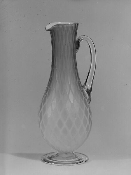 This satin-glass ewer is decorated with a diamond-shaped "air trap" pattern.