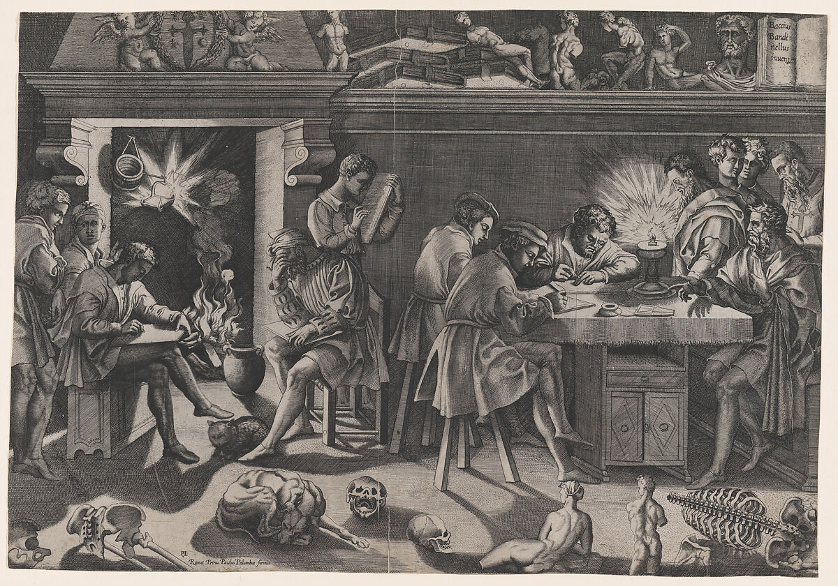By equipping the studio with books and antiquities, Vico presents the making of art as an intellectual enterprise, and by naming the studio an 'academy', he associates it with Plato's famous school. The foreground is strewn with classical statuary and human bones appropriate for anatomical study. Brilliant lamplight and flickering firelight cast evocative shadows and illuminate the figures bent over their work. Some of their poses and groupings are reminiscent of Raphael's famous fresco 'The School of Athens', an analogy that further exalts the character of Bandinelli's enterprise.