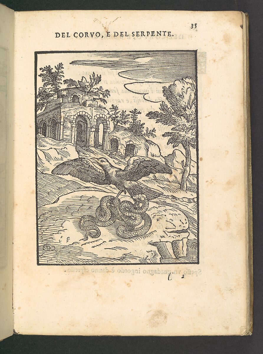 In the fable with an illustration on page 35, the crow, driven by hunger, has seized upon the serpent, who twists around and sinks his venomous fangs into the crow's leg. The scene is full of action as the wounded bird rises up in pain and opens his beak to cry out, 'What am I come to? The food that I hoped would sustain my life has instead caused my death.' The moral is that when acting in one's own interest, it is important to consider the harm that this action may cause others or risk coming to a miserable end.