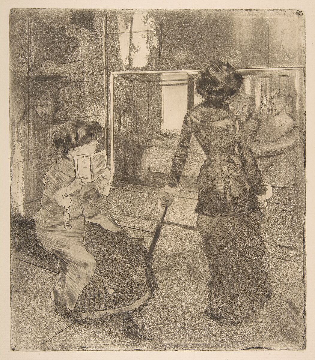 Among the most technically complex of Degas' prints, this view of Mary Cassatt and her sister in the galleries of the Musée du Louvre was intended, like Pissarro's "Wooded Landscape at L'Hermitage, Pontoise" (21.46.1), to appear in the first issue of the prospective journal "Le Jour et la Nuit," on which the two artists collaborated with Cassatt and Félix Bracquemond. The group was intent on achieving new tonal effects in their prints by innovatively working up the surfaces of etching plates, perhaps spurred by achievements in Impressionist paintings or by advances in photography.