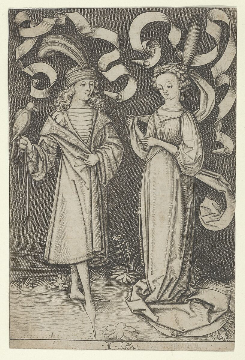 This depiction of courtly love is the most refined within Israhel's series of engravings devoted to amorous relationships, from the chivalrous to the lascivious, among different classes. In fifteenth-century imagery the noble pastime of falconry was traditionally associated with love. Here a falcon perches on the gloved hand of an elegantly dressed suitor. As his beloved demurely gazes down, she throws a furtive glance in his direction. From her headdress a cloth unfurls, echoing the banderoles that flutter above the couple. Such airborne ribbons often displayed a dialogue between the figures: here they may have been left blank so that collectors might inscribe their own.