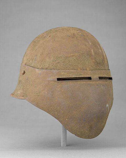 This helmet, and others in the collection of the Metropolitan Museum, were designed by Bashford Dean between 1917 and 1918. Model No. 8 has a visor to provide maximum protection to the face while still allowing good visibility and movement. Model No. 5 gave more coverage to the back and sides of the head than the regulation helmet then worn by American and British troops. The Sentinel's Helmet, Model No. 7, was meant for limited use in forward positions, where heavy fire was expected. Its construction was based directly on a type of Italian helmet that was popular in the fifteenth century.