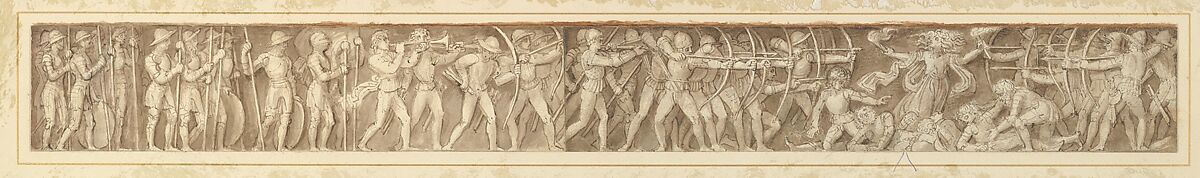 A friend of William Blake and John Flaxman, Stothard worked in a range of media and his linear style was influenced by classical models. This drawing relates to one of a set of four friezes in the Throne Room at Buckingham Palace, works that Flaxman designed and Edward Hodges Baily, R.A. (1788-1867) carved in high relief. Responding to the "Wars of the Roses" the work represents pikeman with plumed helmets, trumpeters, and the mythical figure of Bellona whose torches urge opposing groups of archers into combat.