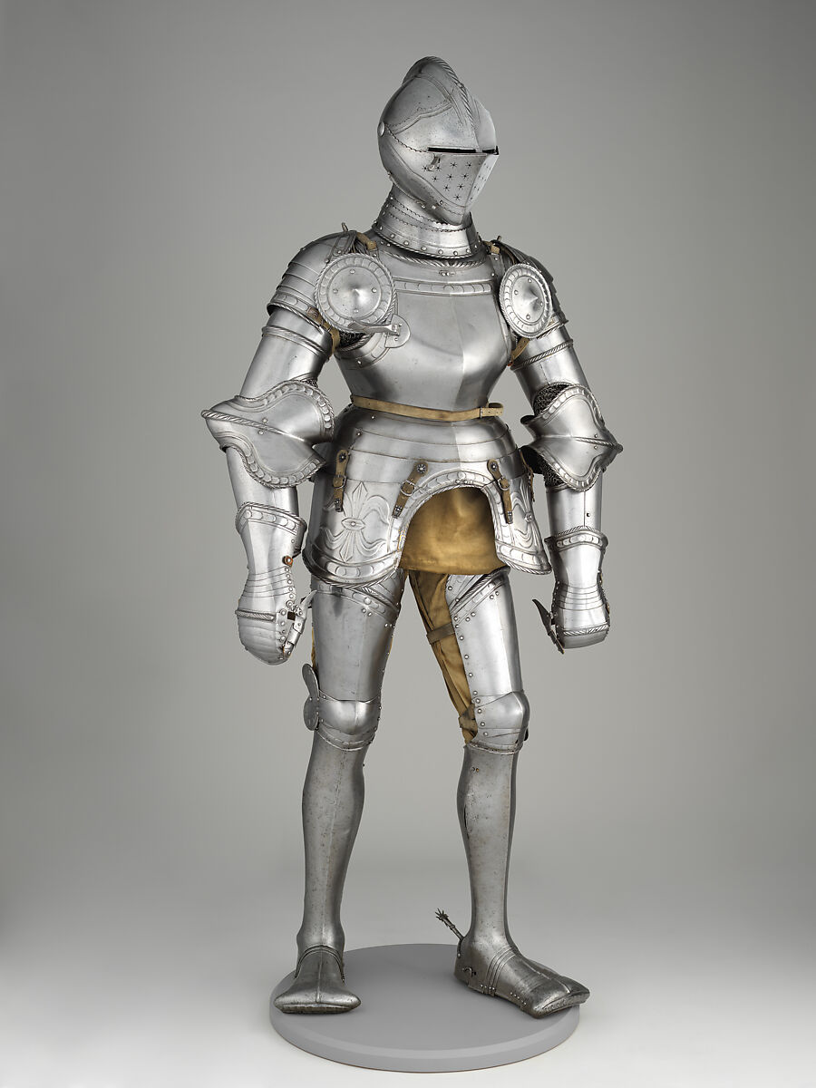 Although relatively plain in appearance, in many ways this armor is typical of armors worn in battle by the knightly cavalry of the mid-sixteenth century. Lacking surface ornamentation such as etching or gilding, it was known as “white armor,” a reference to the unaugmented color of the polished steel. Armor of this type, cap-à-pie (from head to foot), would have been commissioned individually by a noble patron for personal use, as opposed to the even simpler armors that were made in large numbers to be worn by average fighting men.