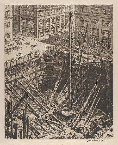 Sir Muirhead Bone was a Scottish printmaker and watercolor artist noted for his depictions of architectural subjects, city views, landscapes, and his work as a war artist in both the First and Second World Wars. After World War I, Bone made fewer prints until he travelled to the United States. His visit to New York City inspired this dramatic birds-eye view of a massive construction site for a new building, the Hotel Roosevelt located at Madison Avenue and East 45th Street (completed 1924). In the excavated pit, Bone drew ant-like workmen scurrying about massive beam supports holding up the retaining walls for the building's foundation; more workmen stand on the platform at the base of a giant crane. At the top of the image, Bone captured a bustling street intersection filled with automobiles and pedestrians. Bone began this large print in 1923, and finally completed it in 1928; it is now regarded as one of the artist's most celebrated drypoints.