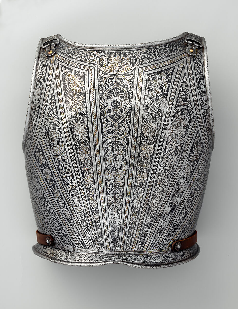 Pompeo della Cesa, whose etched signature “Pompeo” is found near the top of the breastplate in the center, was the foremost Milanese armorer of the late sixteenth century. His patrons included Philip II of Spain, who also ruled as duke of Milan; Alessandro Farnese, duke of Parma; and Emanuele Filiberto, duke of Savoy. Pompeo probably headed a large workshop and also acted as a contractor in cooperation with other shops to fill particularly large commissions. The decoration includes bands of trophies alternating with bands of allegorical and Biblical figures, one of several distinct decorative styles employed in Pompeo’s workshop.