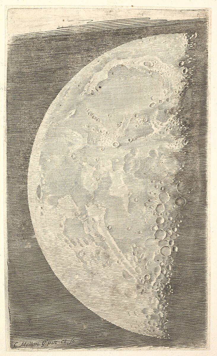 This modern-looking engraving is one of three remarkable prints by Mellan that depict the phases of the moon after sketches he made in Aix-en-Provence in early 1636. Mellan drew what he observed through a telescope, a Dutch invention from about 1608. The engravings were commissioned by Nicolas-Claude Fabri de Peiresc, a French humanist, and Pierre Gassendi, a theologian with a passionate interest in astronomy. Mellan completed the prints upon his return to Paris in May 1637. Peiresc, who died in June of that year, never saw the finished works.