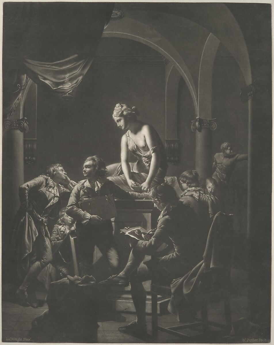 In a stone chamber containing the "Nymph with a Shell and Borghese Gladiator," six fancifully dressed young artists have assembled to sketch by lamp-light. The virtuoso realism—exemplified by the chipped stone plinth—belies the scene's mysterious, romantic mood. Pether's exquisite mezzotint, based on a painting by Wright, displays subtle tonal range, with deep shadows warmed by the brownish hue of the ink. Against a range of velvety darks, highlights—such as the protruding sheet beneath the foremost draftsman's sketch—appear almost to glow.