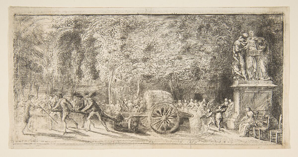 Idealized scenes of garden recreation have a long history, but these are distinctly topical. Indeed, the catalyst for Saint-Aubin’s etchings must have been the amenities recently introduced by the governor of the Tuileries Palace, including a concession for chair rentals and the newly devised watering cart, intended to reduce the amount of dust stirred up by visitors.