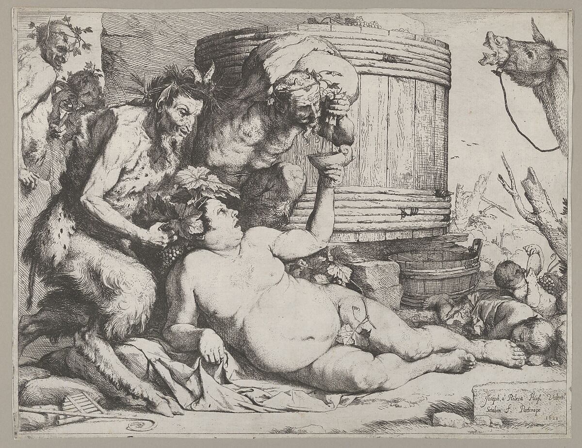Ribera's etchings helped him to establish a reputation far beyond Naples, where he lived for most of his life. This etching is often considered his greatest. It relates to a painting he had produced two years earlier now in the Capodimonte Museum in Naples. Occupying the foreground Silenus is crowned by Pan, who is identified by his leopard skin cloak and pan pipes and staff at his feet. Silenus raises his cup to accept another drink of wine. His action is humorously echoed by the two infants at right engaged in similar activities, one of which has passed out. The braying donkey at right adds to the hilarity of the composition. For his composition, Ribera drew inspiration from the prints of other artists, including Mantegna's pair of Bacchanals (29.44.15) and Annibale Carracci's Drunken Silenus (27.78.1.150).