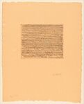 Central to Twombly’s art are allusions to processes, gestures, and forms of writing. Whether tight and multiplied, as in Note I, or enlarged and loose, as in Untitled I, made the same year, Twombly’s rhythmic glyphs and flowing lines evoke a range of associations, including graffiti, children’s doodles, and exercises for learning script, such as the Palmer Method, a muscle training technique that promises greater efficiency and uniformity in handwriting. Twombly’s inimitable marks, however, lack the perfected regularity promised by such exercises. Rather, by showing variations in the slanted, looped forms, densely layered in regulated horizontal lines compressed in a tight rectangular space, Twombly gestures to the fatigue generated by the act of writing, while also revealing the poetry possessed by the wiry and irregular etched forms.
