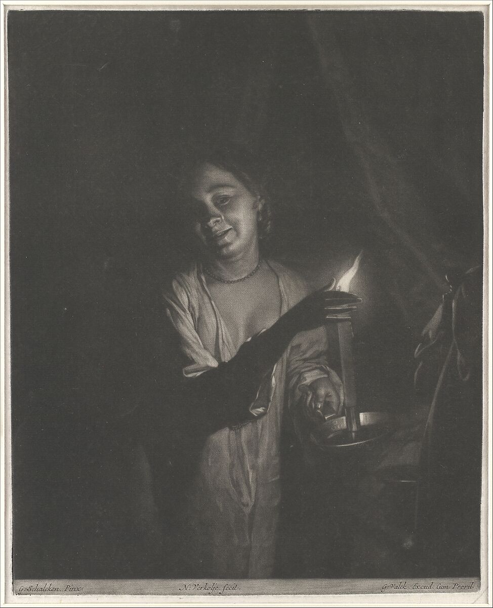 Verkolje, a painter of portraits and subject pictures active in Amsterdam, learned mezzotint printmaking from his father. In the present work, he reproduced a design by Schalcken, a Dutch painter and etcher celebrated throughout Europe for his depiction of artificial light. (During an extended sojourn in London, from 1692 to 1697, Schalcken famously painted King William III by candlelight.)