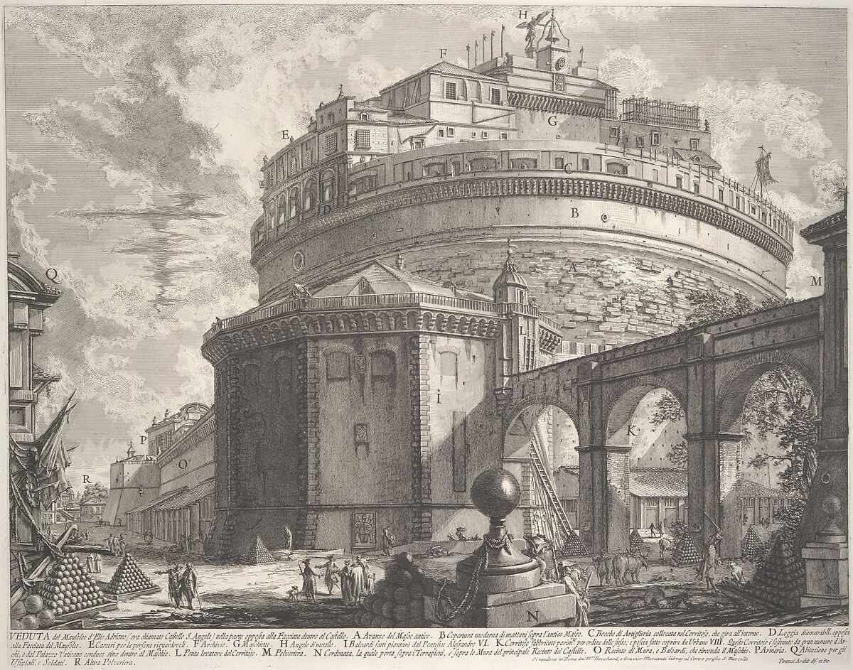 Piranesi's earliest views of Rome, such as the Piazza del Popolo (37.45.3.49), had placed the principal buildings at the back of a vast, tilted space, filled with a diversity of human activity. By the mid-1750s, the monuments fill the space more commandingly, and are seen as if from below and close at hand, as in this view of the Castel Sant'Angelo. Piranesi produced this view at the same time he was working on the Antichità Romane (41.71.1.3.49; 41.71.1.3.53), his four-volume archaeological treatise, and it may have been originally intended for that work. The clear didactic character of the image and the type of lettering are characteristic of the Antichità Romane, although the dramatic view of the castle as it appeared in the eighteenth century is entirely in keeping with the other Vedute. The buildings at the top of the structure served as a gracious and well-fortified refuge for the pope in times of trouble—the corridor that stretches to the right atop huge arches leads all the way to the Vatican Palace.
