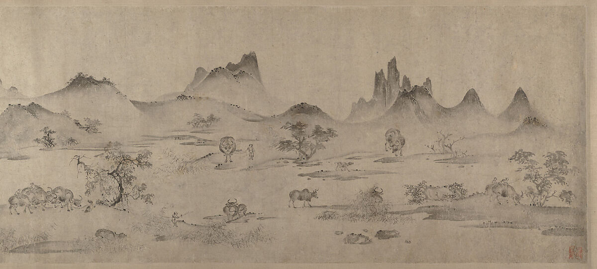Myriad water buffalo spread across this gentle river landscape in scenes of play, work, and relaxation. Some are guided gently by country oxherd boys, while others are ridden around and through the cool waters, lounge by the riverside, or scratch their weary hides. While the ox sometimes featured in Buddhist images, this painting presents the ox and oxherd as symbols of the simple joys of life in river country.