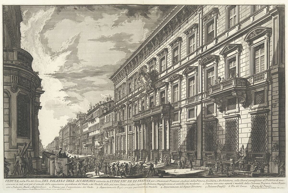 - Title: View along the Via del Corso of the Palazzo dell'Accademia, established by Louis XIV, King of France for French students of Painting, Sculpture and Architecture..., from "Vedute di Roma" (Views of Rome), part I