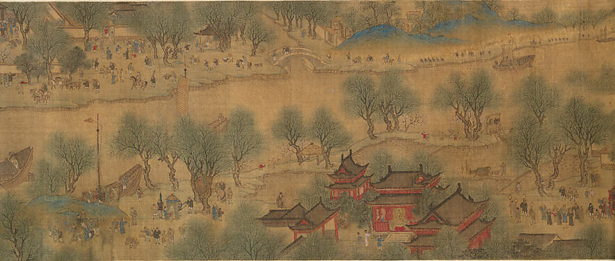 In the early twelfth century the court artist Zhang Zeduan painted a handscroll depicting the Northern Song capital of Bianliang (Kaifeng) at the time of the Spring Festival (Qingming jie). Zhang's painting, which lovingly and minutely describes the daily life of the capital's inhabitants, became the paradigm for more than forty later evocations of this theme. This version, which is longer, compositionally more complex, and more brilliantly colored than the Song original, reflects the stylistic innovations of the Suzhou professional painter Qiu Ying (ca. 1495–1552), whose signature has been added at the end. But there are several reasons for assigning the scroll to a later date. Not only is the execution less meticulous than that of genuine works by Qiu, but the addition of elaborate palaces, a display of horsemanship and archery skills, an imperial procession, and a hunt— none of which appear in the original—point to the influence of imperially sponsored commemorative paintings that originated with the Southern Inspection Tour of the Kangxi emperor (r. 1662–1722).