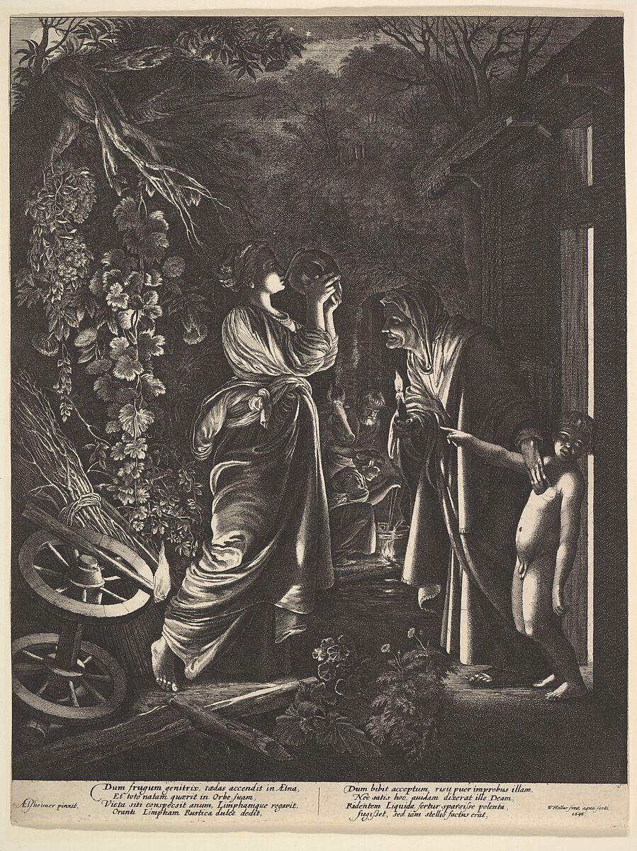 Mocking of Ceres, a nocturnal scene; Ceres drinks avidly from a jug of water given to her by an old woman holding a candle at a doorway; besides the elderly woman is Stellio, a naked youth, who points at Ceres; a burning torch rests on some wooden wheels; in the background a woman milks a cow.