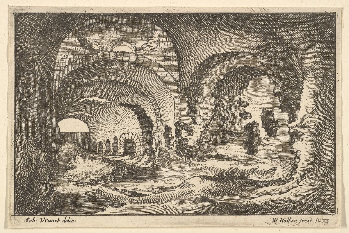 Interior of ruined Roman galleries at Tivoli, ending in fence on at far left; after Sebastian Vrancx