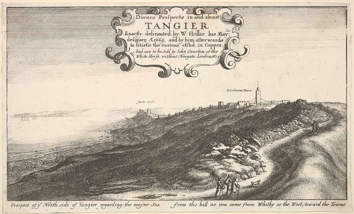 Series title, from a series including five additional Tangier views. View from Tangier onto York Castle and Peterborough Tower; in the foreground, three figures and a dog; on the left, the coast, with horses and carts, and the sea, with ships; in the distance, hills; ornate cartouche at top center.