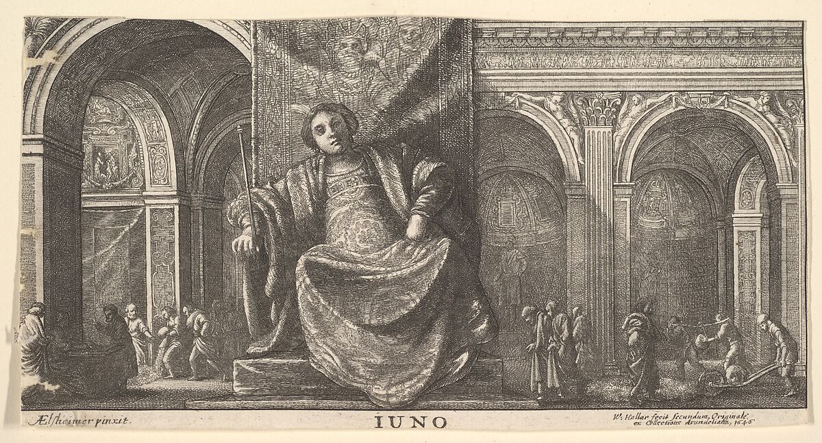 Juno seated on tall throne with tapestry behind, wearing embroidered dress and fur-trimmed mantle and holding sceptre in her right hand, leaning slightly to left; men at work under vaults in the background; after Elsheimer. The painting was in the Arundel collection but is now lost (see K. Andrews, 'Adam Elsheimer:Paintings-Drawings-Prints', Oxford 1977, under no. 22).
