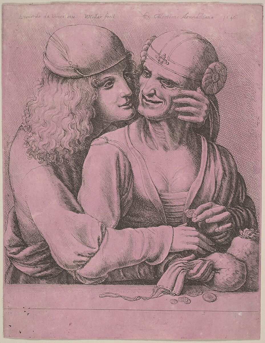The source for this image depicting an amorous young man and older woman was attributed to Leonardo, who obsessively represented pairs of contrasting physiognomies: youths of ideally perfect beauty often face elderly types with physical deformities. Though the inscription on the print confirms the original work was in the Earl of Arundel’s collection, a drawing with this figural composition by Leonardo does not survive. In the master’s writings of the early 1490s, he quoted Petrarch underneath a sketch of a grotesque woman, "What is fair in mortal beings passes and does not last
