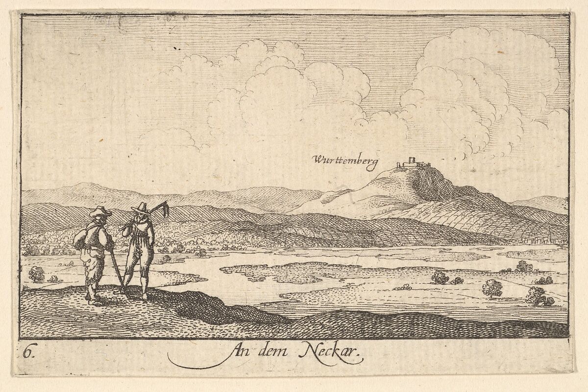 A distant prospect of a river valley with a castle on the summit labled 'Wurttenberg'