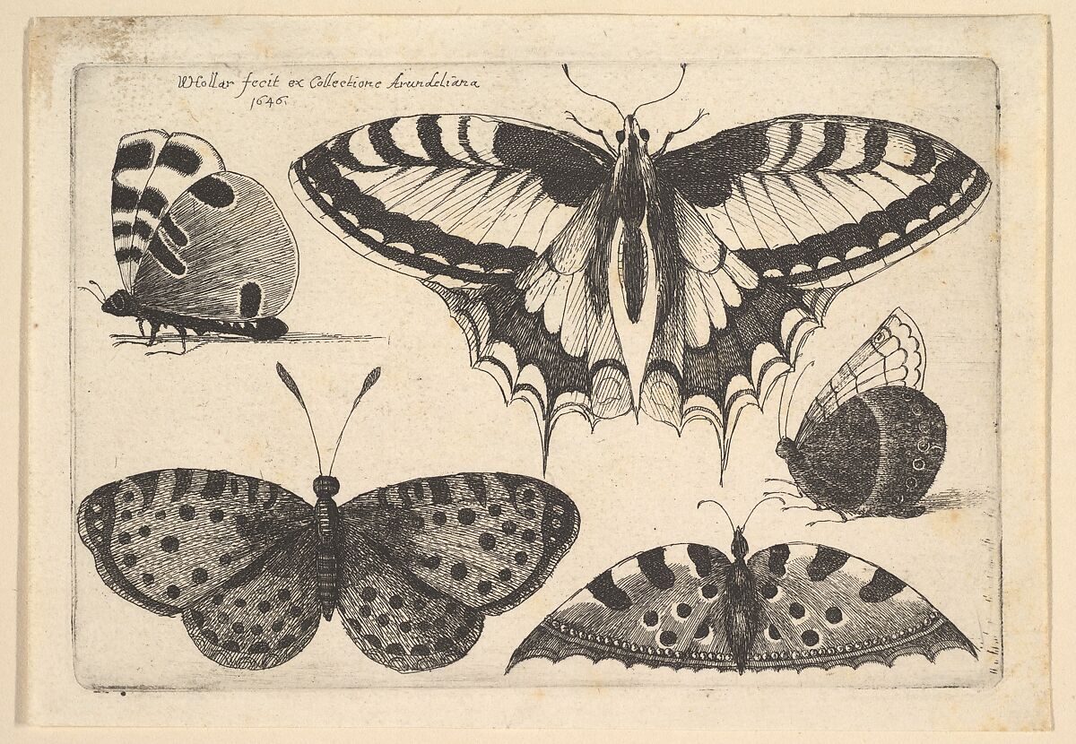 Swallow-tailed butterfly with open wings above on right, next to small butterfly in profile to left; two small butterflies with open wings and butterfly with closed wings looking left on right below.