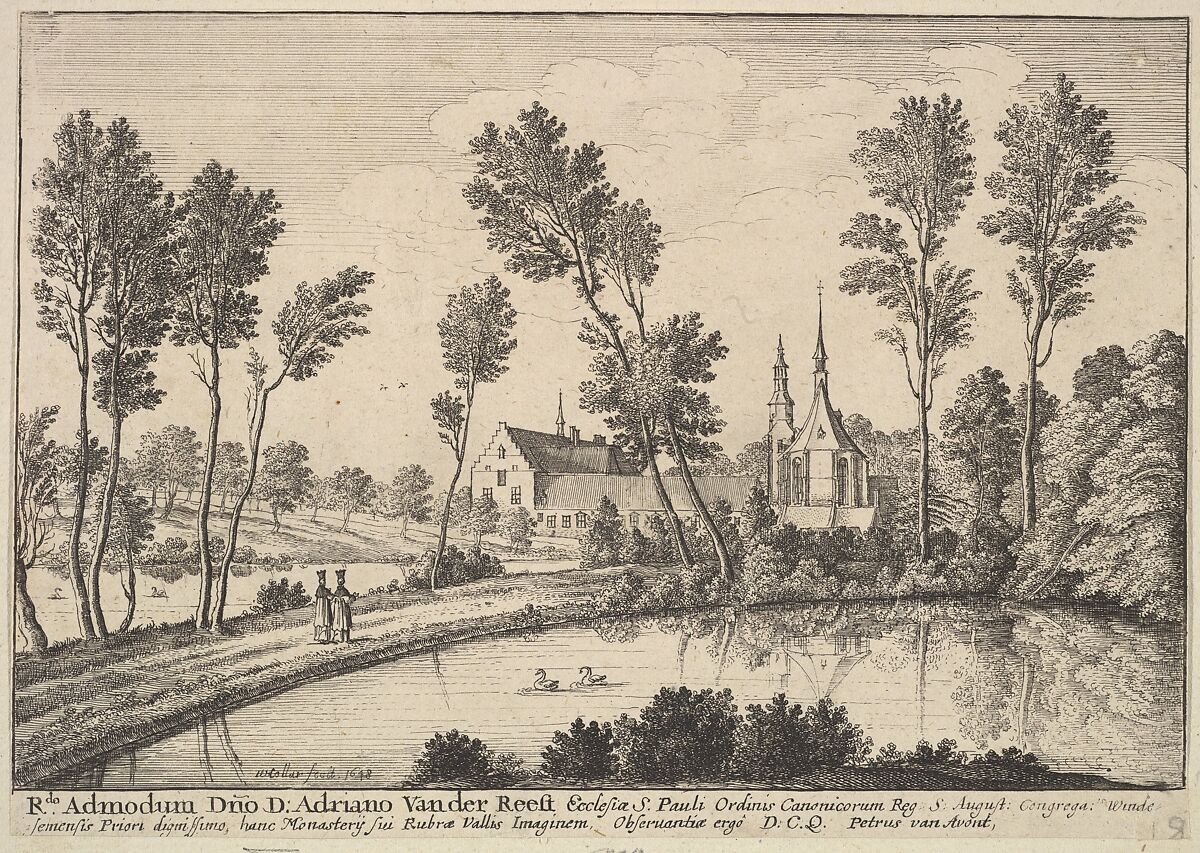 Rothendael Abbey seen across a lake surrounded by trees, with two swans on the water. Two clerics walk along a path at left, and the abbey is seen in the distance near a river.